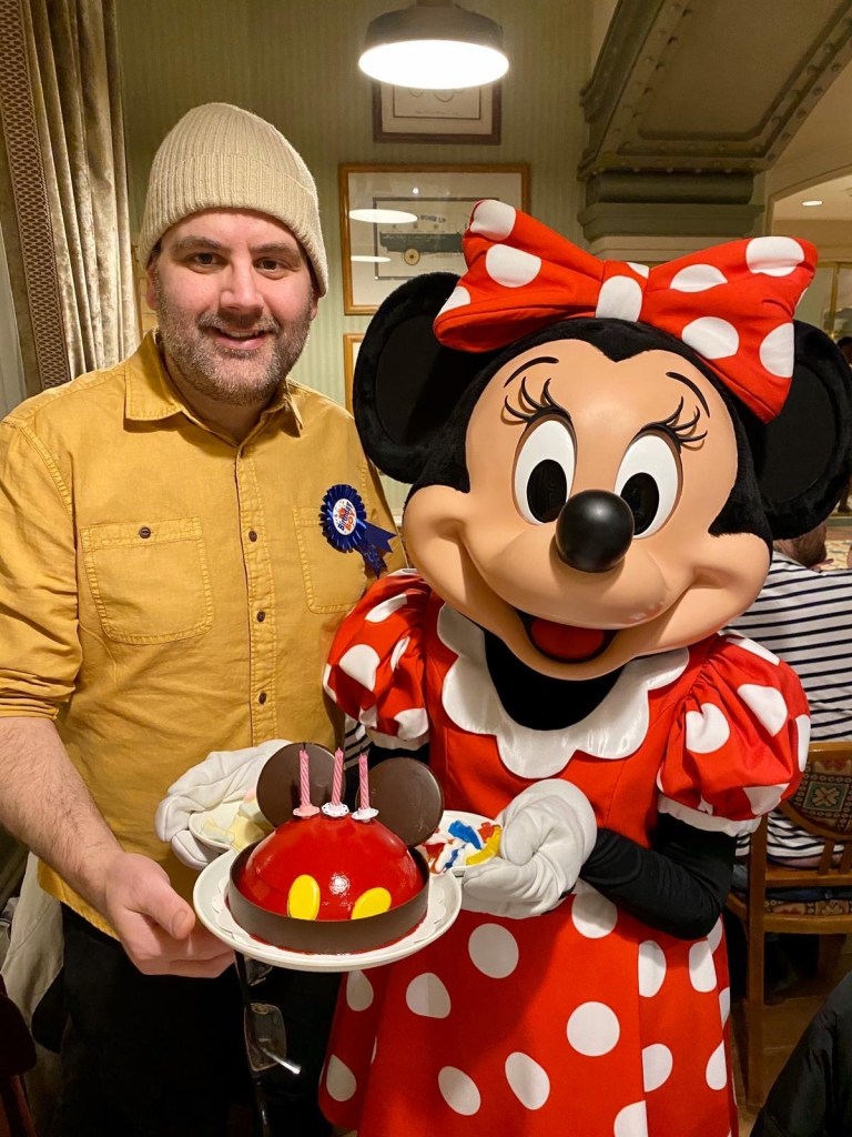I haven’t mentioned the titular cake yet, but its important to set the scene, the restaurant itself is decorated with inventions from the past in thematic extension of the Jules Verne inspiration for Discoveryland. Discoveryland being France’s reimagined version of Tomorrowland, where futurism is exchanged for a celebration of the real and fictional inventors and explorers of the past. The food in Inventions ranges from charcuterie, simple pasta and meatballs to fresh seafood, roast lamb and duck. Along with the food we had Glowtinis to celebrate – a Martini with a flashing ice cube. As we dined the characters interacted with us and we had several photos with Goofy, Pluto, Mickey and Minnie. Each of them kindly signed my birthday card. As we washed down our Frozen themed desserts, bizarrely not frozen, the ambient music in the restaurant stopped. The relaxing piano gave way to an energetic pop song, with all of the cast members and many of the diners clapping along, it was a birthday song and before I could put the obvious pieces together there was Minnie Mouse standing at our table with a birthday cake, inviting me to blow out the candles and make a wish. I had no wish to make, for a moment life was perfect, in every way. Minnie stayed with us for ages, asking me questions and posing for photos with the cake. The previous stresses and strains of the day were well forgotten.
