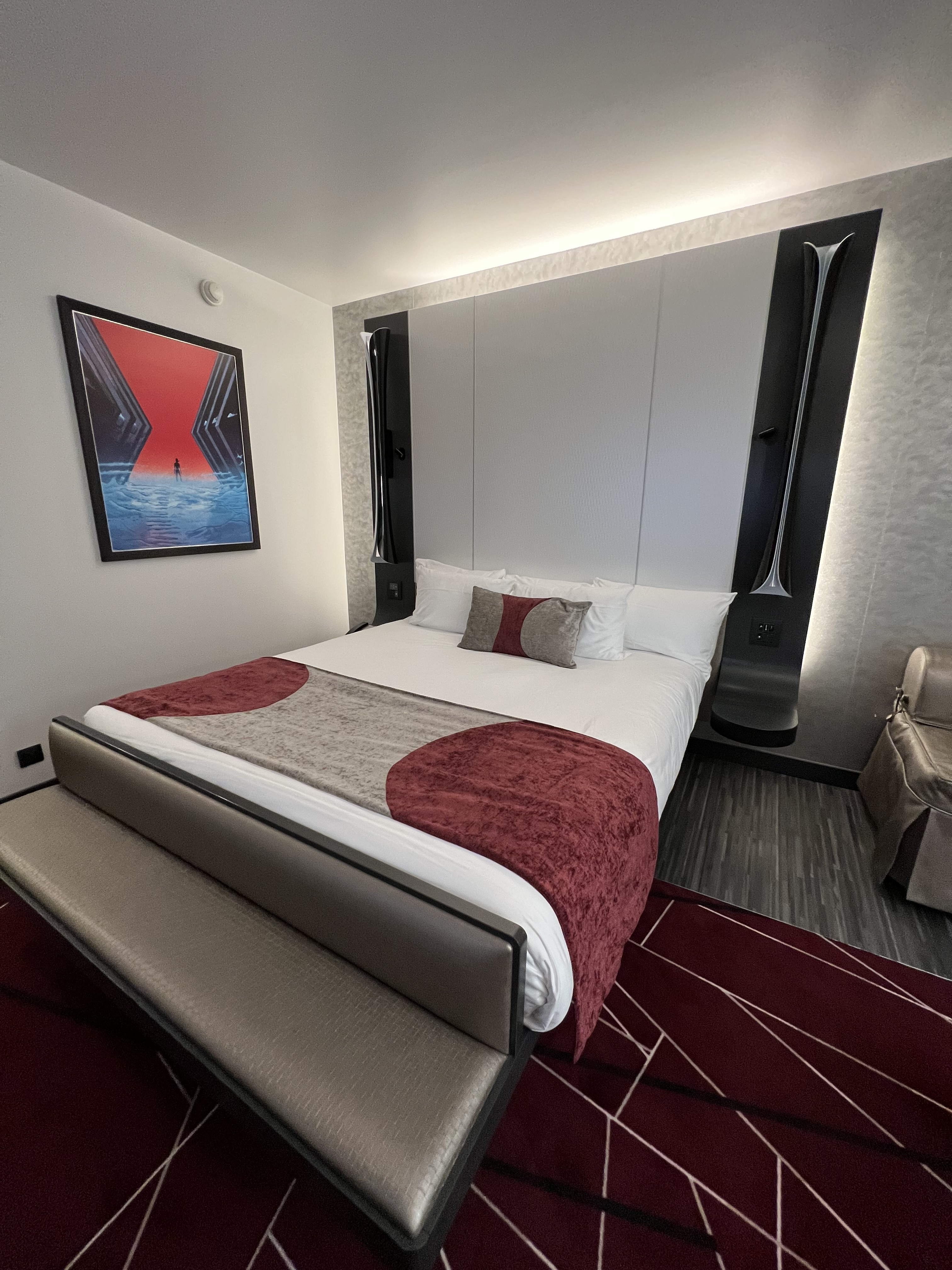 The Hotel itself is an elegant and sleek tribute to art deco whilst also boasting some incredible Marvel Artwork and props. What is less obvious are the decorative touches like the etched metal panelling in the hotel lobby there are special touches everywhere. Each floor is themed to a different character, the ground floor is Spiderman, the first floor is Captain America and so on, its worth exploring the hotel just to check out these huge and yet intricate art pieces. The room is a continuation of the hotel, a pocket of gentle luxury with the impressive mirror/TV ready to welcome guests to the room – and surprisingly easy to stream to! There are lots of useful extras an ironing board, iron (insert an Iron Man joke here), safe, coffee maker, kettle and fridge are all present and ready to make your stay more comfortable. The bed is huge the light fittings are beautiful and the bathroom is a contemporary wet room that feels like its been exported from a spa hotel. Every morning we almost regretted leaving our room to go into the park, and as I said previously, we went back to the hotel most days just to decompress and enjoy a change of pace.