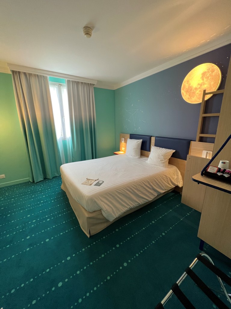 The bedroom was a good size, freshly decorated with a turquoise colour scheme featuring constellations and a gorgeous moon detailed light on the back wall illuminating the room and on the other side of the room was a second themed light in the shape of a balloon. The room also featured hotel staples a TV, safe and mini fridge. The bathroom was a lovely spacious wet room with a shower tray and no bath, although we were given a disability friendly room so I can’t speak for bathroom facilities in other types of rooms. The room felt brand new and recently decorated, there was even cellophane over the hairdryer in the bathroom. Bedside tables feature adjustable reading lights and USB ports. Unfortunately, there are no drawers in the room, so your case will need to be where you keep anything you don’t hang in the two small hanging areas. For short stays this is fine, but for longer stays this could be an issue. Tea and coffee making facilities are in the room with disposable cups.