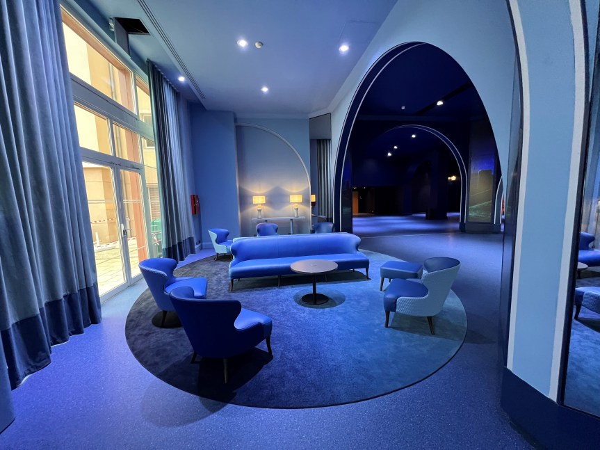 Transitioning from the reception area to the bar/lounge is like walking through a wardrobe from an old professor’s house into Narnia (coincidentally the professor in The Lion The Witch and the Wardrobe is himself a magician’s nephew?). From the red of the Big Top you enter a midnight blue fantasy realm with huge animated windows into fantastical gardens between which are arches which form portals into intimate cosy blue lounge areas. This feels much more like a magical world than a circus, and the aesthetic and detail offer a modern take on themed hotels that isn’t matched in several of the on property Disney hotels. The sheer amount of space in the hotel is incredibly calming and relaxing.