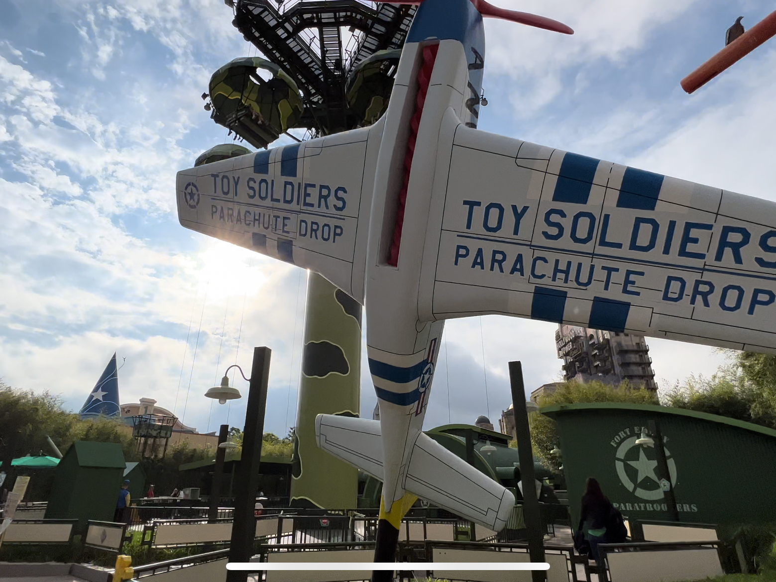 The Toy Soldiers Parachute Drop always filled me with fear and I only recently went on it for the first time. Despite being afraid of heights it wasn’t that or dropping sensation, its because a staple of my childhood was seeing these parachuting soldiers caught in overhead wires. UK public safety films had made me terrified of overhead lines and so by transference the little soldiers, their useless parachutes and the certain death of anyone who ever tried to untangle them left me sweaty and panicked when I first saw this ride. The ride dominates the skyline of the Toy Story Playland mini land nestled within the wider Worlds of Pixar area of the park.