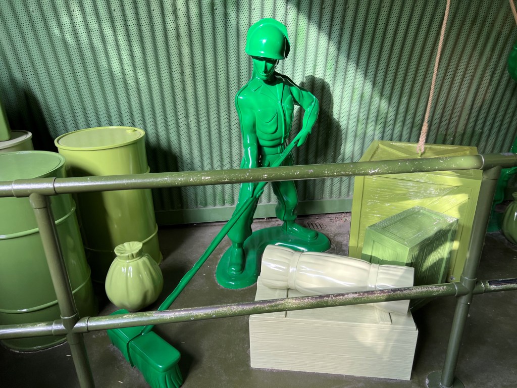 10, or so, visits to the Walt Disney Studios at Disneyland Paris later and I finally fought back 70s propaganda and jumped on the ride. Usually this ride enjoys 40-60 minute queues, however Extra Magic Time meant I only had a 5 minute wait, another benefit was that I had less chance to back out. Racing through the queue line I was immediately assured, the soldier codenamed Alpha Bravo guarding the ride with his walkie talkie recalled the scenes of Andy’s birthday party from the original Toy Story movie. The rest of the ride station and pre show is filled with the toy soldiers and army regalia. I was surprised to see just how themed the area was, my favourite soldier is the one acting as look out in a high tower, watching over guests safety through green plastic binoculars.